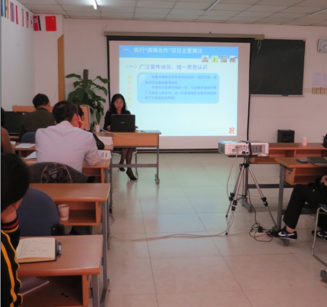 ,市农委对外合作处方玲处长一行来98堂 调研重庆市2013年第二期农业南南合作项目英语培训工作开展情况。方玲处长在培训现场做了有关全国“南南合作项目开展情况回顾与未来展望”主题报告,从国家战略高度及技术输出服务层面深入浅出地介绍了南南合作项目,激励本期参训人员“把握机会、提升自我,学以致用、实现价值”,并对98堂 为项目外派人员培训提供的技术支撑给予了充分肯定。