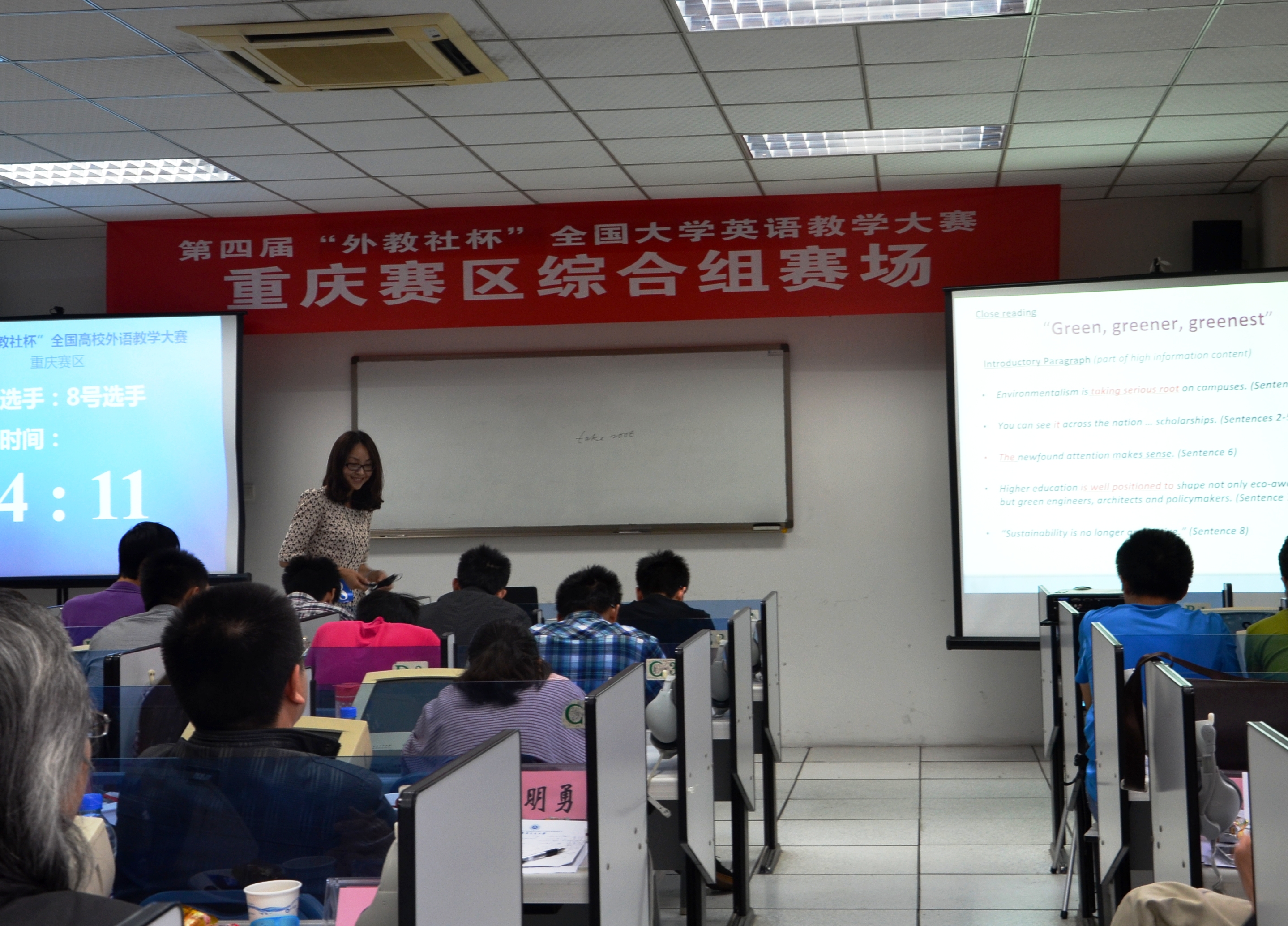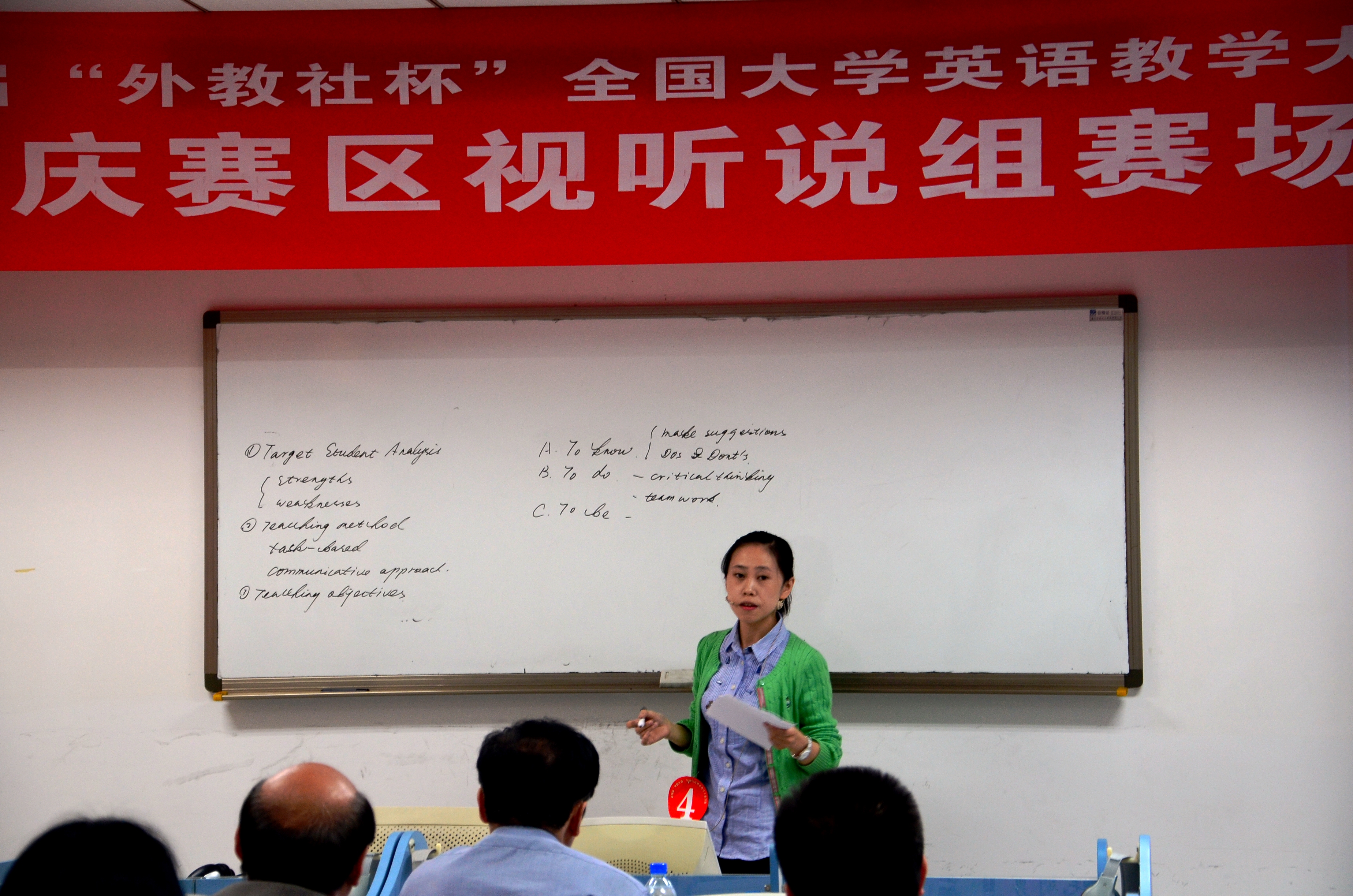 经过选拔,推选出了雷雷(大)和张宏两位老师分别参加了重庆市“综合组”和“视听说组”的比赛。经过18日的紧张角逐,雷蕾老师在复赛中,凭着其扎实的语言功底、流畅的口语表达、精心设计的教学课件、明确的教学目标和科学有效的教学组织获得了在场众多评委的一致肯定,以排名第一的优势成绩进入决赛。在19日的决赛中,雷蕾老师在十分钟的说课和五分钟的问答环节中,对教学材料把握准确,教学环节清晰完整,教学内容充实丰富,陈述简洁清晰,教学理念体现得当,对专家的提问能够应对自如,最终以两天比赛总分第一获得了第四届“外教社杯”全国高校外语教学大赛(大学英语组)重庆赛区决赛视听组特等奖,并将代表重庆市高校教师参加将于11月在上海举行的全国比赛。