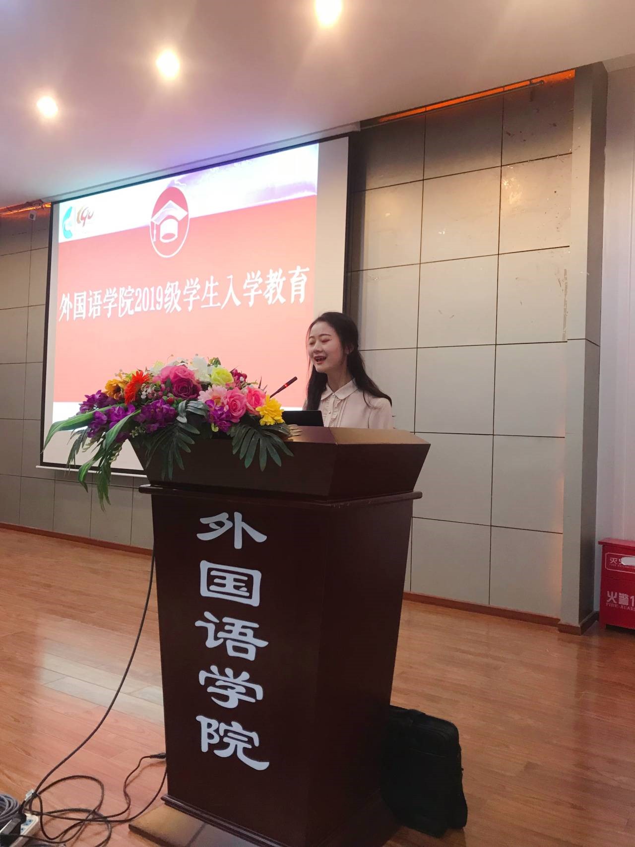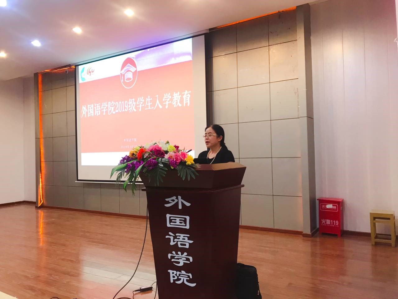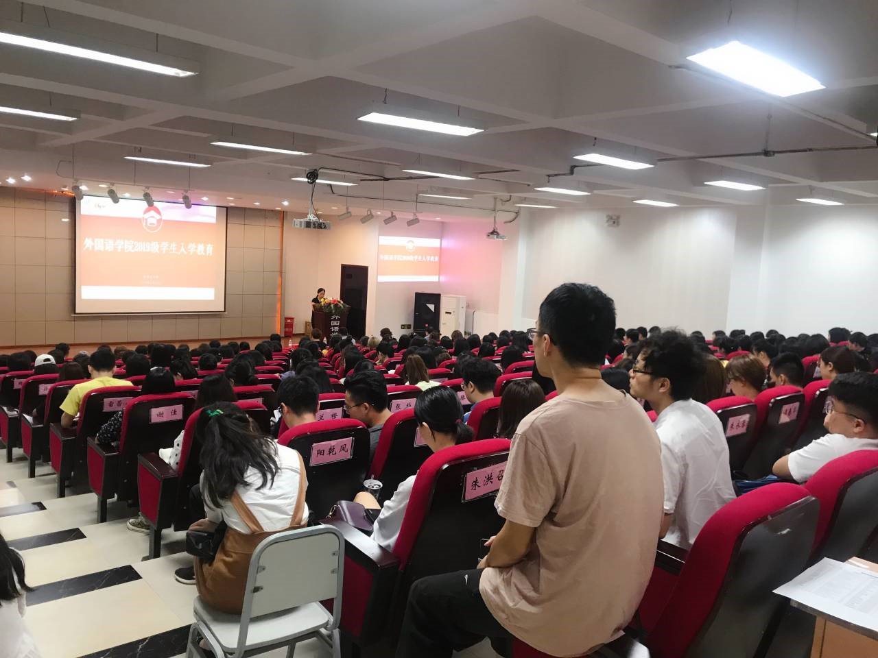 党委书记欧玲教授、院长彭静教授、副院长李小辉副教授、英语系主任毛凌滢教授,2019级本科新生与研究生新生共220余人出席了本次大会。