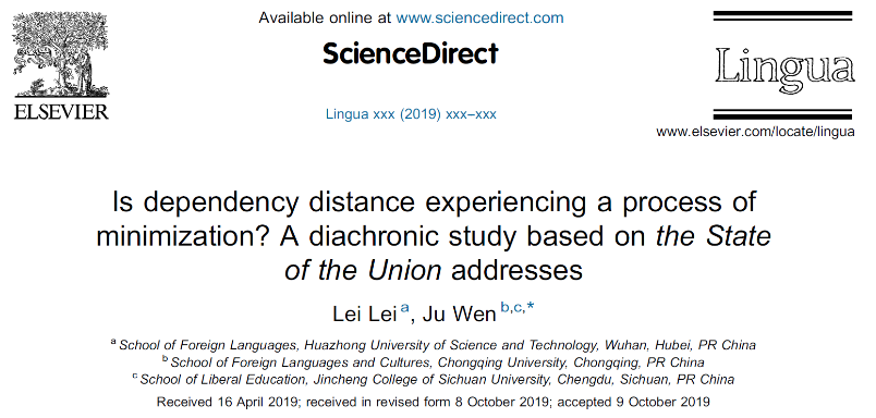 Lei, L. and Wen, J. (2019) Is dependency distance experiencing a process of minimization? A diachronic study based onthe State of the Unionaddresses, Lingua. doi://doi.org/10.1016/j.lingua.2019.102762.