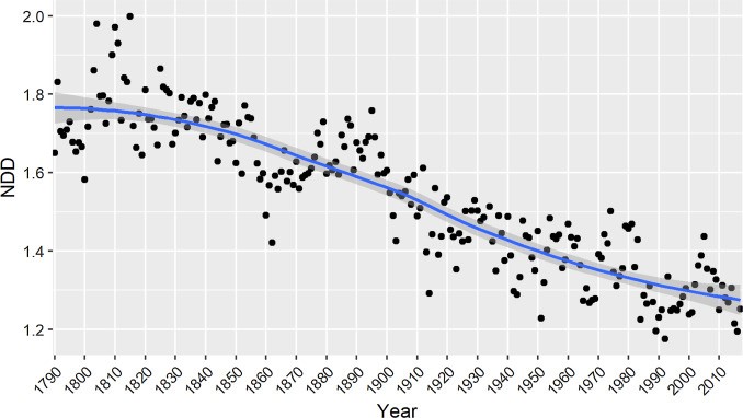 作者采用横跨200余年的美国国情咨文语料构建了依存树库,通过观察两个世纪以来MDD和NDD这两个句法复杂度衡量指标的历时变化,验证了提出的假设,为“依存距离最小化”这一语言演化现象提供的历时的证据支撑。