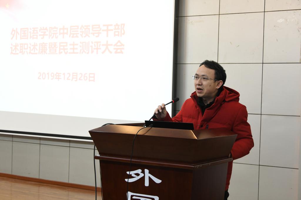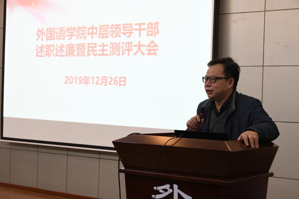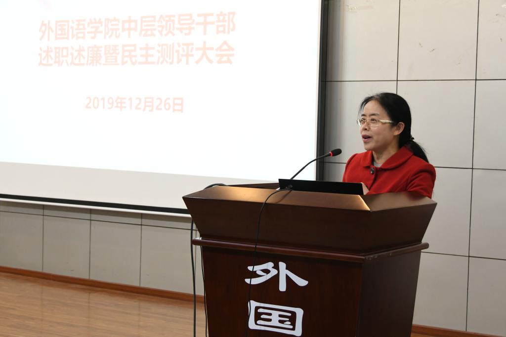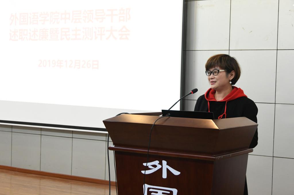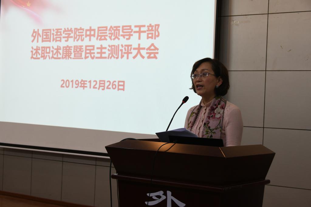 接着,党委书记欧玲代表学院领导班子做了题为《以一级学科建设为抓手,实施人才培养质量工程,推动外国语言文学学科建设实现新跨越》的述职报告,向大家汇报了一年来学院在落实党委主体责任、加强教师队伍建设、提升人才培养质量、提升学科影响力、推进国际合作交流等方面所进行的努力和取得的成绩。2019年是98堂