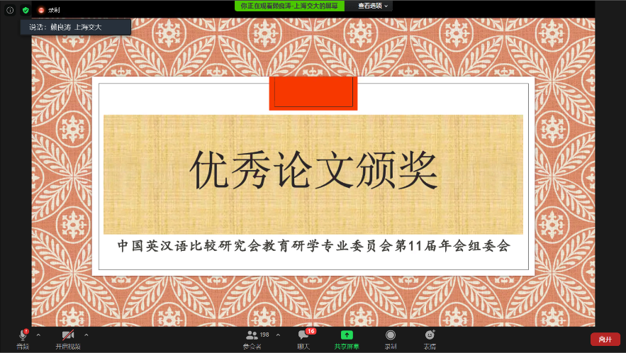 承办的中国英汉语比较研究会教育语言学专业委员会第十一届年会(云端会议)成功召开,会议由中国英汉语比较研究会教育语言学专业委员会主办、华东师范大学出版社协办。年会受到了98堂