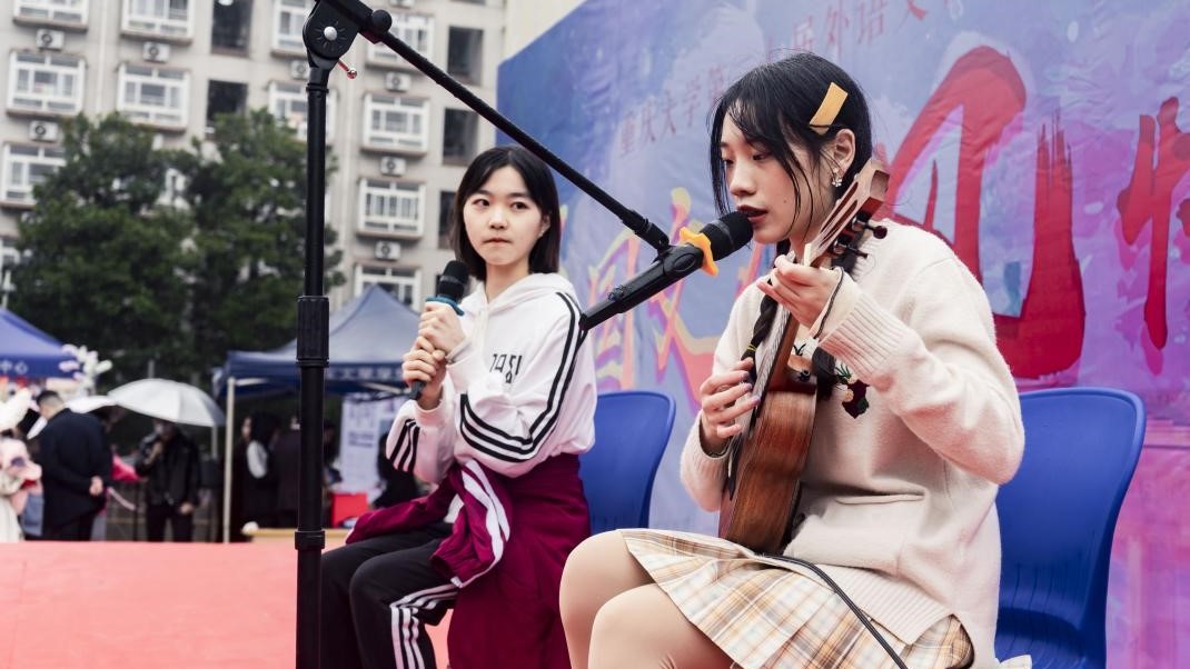 学生艺术团管乐队的《千与千寻》经典曲目合奏渲染了会场的异域风情。除此之外,中间还穿插了有趣又紧张的抽奖环节,奖品丰富。活动现场一片欢声笑语,即使是在细雨蒙蒙的天气,同学们依然热情高涨。