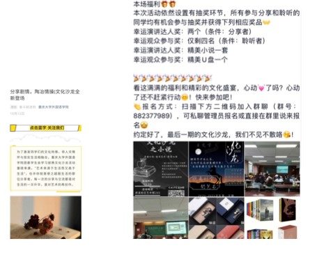 官方QQ等线上平台的宣传,文化沙龙线下活动中共有16位分享者报名,近两百名观众到场聆听电影和小说分享。