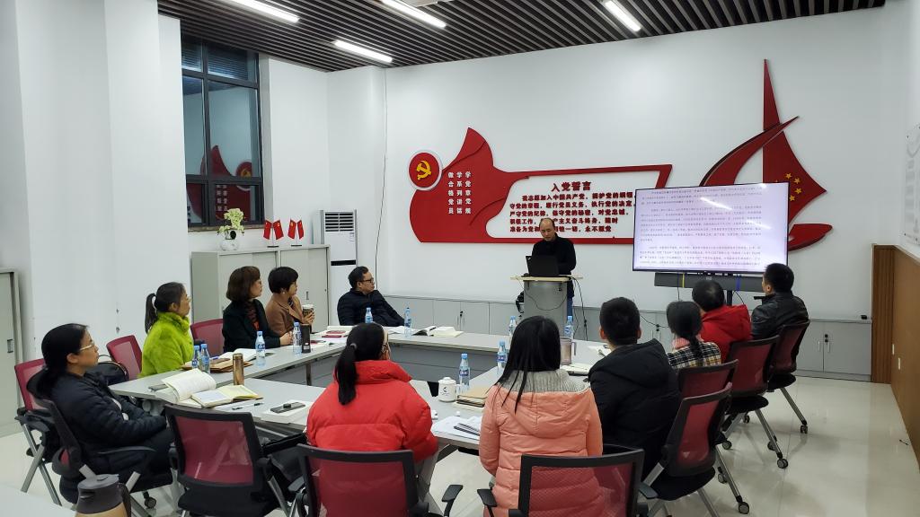 会上,学院纪委委员李良炎领学了《中国共产党章程》,回顾了党的发展历史及入党誓词的演变过程。他从“首部党章诞生与留存”的故事开始,讲述了革命战争时间在国民党白色恐怖笼罩下,共产党员张静泉及其父亲如何冒着生命危险,想方设法保护和秘藏首部党章的故事,并带着大家一起回顾了中国共产党历次全国代表大会的简况。接下来,他从《中国共产党章程》出发,着重讲解了入党誓词的演变过程,追溯了大革命时期、土地革命时期、抗日战争时期、解放战争时期、新中国成立前后等不同时期入党誓词的发展变化,呈现了党的历史进程中各个阶段不同形式的誓词文件。一张张珍贵的历史图片资料、一个个感人的故事,引起了在座党员对于入党初心的强烈共鸣。