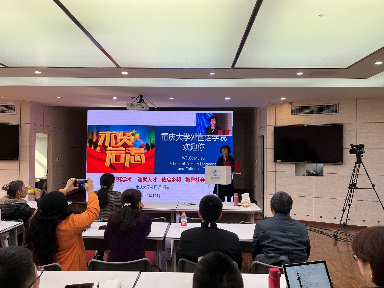 学院党委书记欧玲做主题发言。她详细介绍了学院发展历史、学科建设、人才培养、队伍建设、科学研究以及人才引进需求、考核方案等情况。欧玲讲到,经过几代外语人的不懈努力,98堂