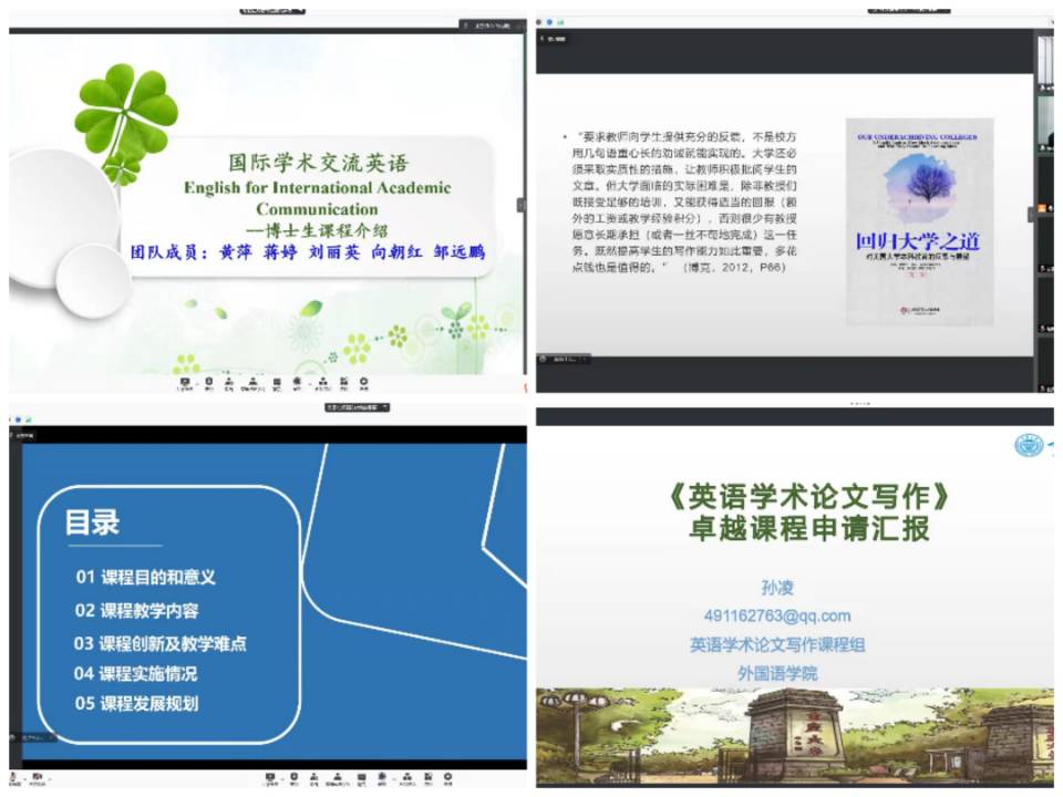 2021年12月29日,第二期大学外语卓越课程建设评审会通过腾讯会议如期召开。会议由李小辉副院长主持。大学外语教育中心孙凌、陈晓莉、邹远鹏三位老师分别代表学术英语写作(本科),学术交流英语(硕士),国际学术交流英语(博士)三门课程进行了课程汇报。三位老师清晰地汇报了课程教学目标,课程内容,课程实施情况,考核方法,以及课程的“两性一度”。