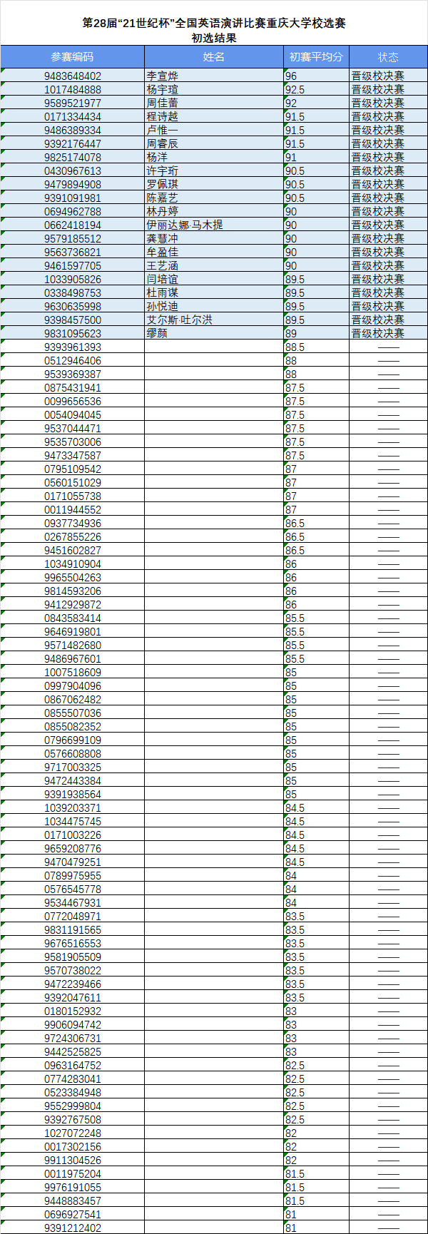 经报名资格初审、评委评定,现将第28届“21世纪杯”全国英语演讲比赛98堂 校选赛初选结果及晋级校决赛名单公布如下。其他相关事宜,请选手在校初赛、校决赛群内获取。