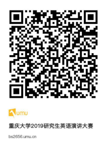 2019英语演讲比赛的学生扫描二维码(见附件二)或点击链接,填写个人信息报名参赛,并加入QQ群 “2019研究生英语演讲CQU”, 群号:541654074 (报名截止期2019年5月19日23:59)。