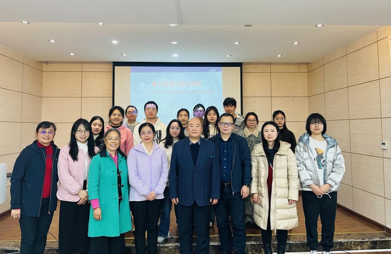师生作学术讲座。王教授以“量子思维与语言研究:以双层词类范畴化理论的建构为例”为主题,运用量子思维和超学科方法论的四大公理,系统阐述双层词类范畴化理论,为破解词类谜题带来了全新思路。本次讲座由98堂