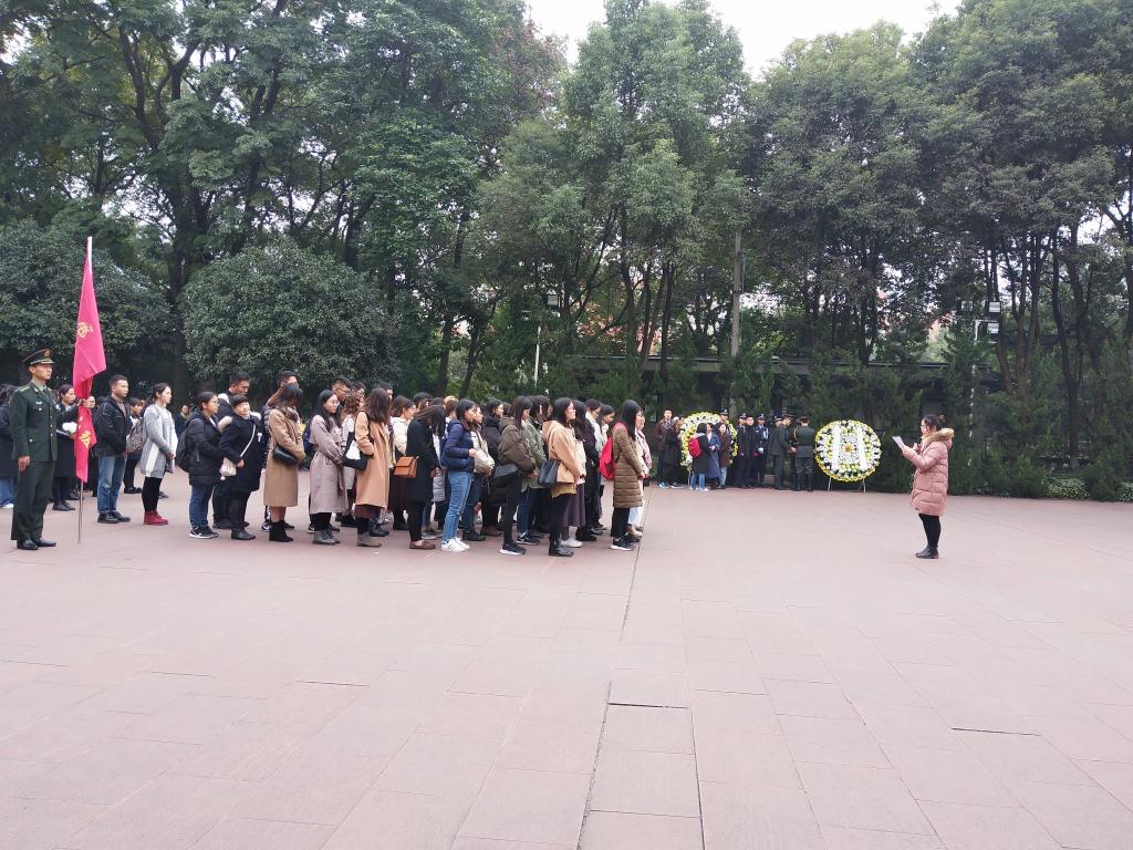 全体学员按小组在革命烈士纪念碑前整齐列队,缅怀革命先烈仪式由杨玲丽同学主持。首先,朱慧同学代表全体学员做了发言,回顾了11月27日大屠杀那段惨痛的历史,她提到今天的光明和幸福是革命烈士用鲜血和生命换来的,我们应该学习革命先辈的爱国主义精神和英雄气概,让青春在建设祖国的奋斗中闪光。在党的领导下,牢记使命,继承爱国传统,做中华民族伟大复兴事业的开拓者。然后,学员代表杨春雨、罗啸天向革命烈士敬献花圈。最后,全体学员在革命烈士纪念碑前肃立默哀。默哀毕,所有学员围绕革命烈士公墓敬献小白花,表达对革命先烈的缅怀之情。