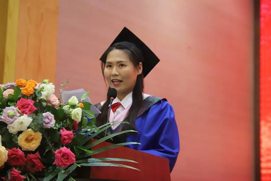 这四年的成长蜕变,她感慨大家曾受过的苦、流过的汗,更强调了坚持才最终成就了大家。在四年的学习生活中,她收获了学业的成功,也感受到工作上的成就感和肩膀上的责任。她鼓励各位毕业生,要不忘母校和学院的栽培,在自己擅长的领域中发光、发热。