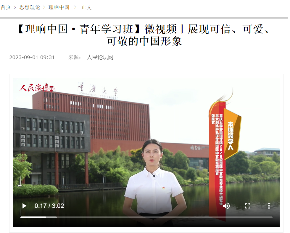 党委一直以来高度重视习近平新时代中国特色社会主义思想“进教材”、“进课堂”和“进头脑”,采用灵活多样的方式组织师生学习习近平新时代中国特色社会主义思想。在得知“理响中国·青年学习班”的征集启事后,学院组成了以党委书记欧玲为组长、支部书记、专业导师、拍摄技术人员和国际中文教育研究生为成员的团队,策划和制作“理响中国·青年学习班”微视频。经过师生团队精心选题,确定脚本内容结构,细致打磨脚本和选景拍摄,师生团队作品近日被“人民论坛网”选用(理响中国·青年学习班微视频丨展现可信、可爱、可敬的中国形象//www.rmlt.com.cn/2023/0901/681791.shtml)。