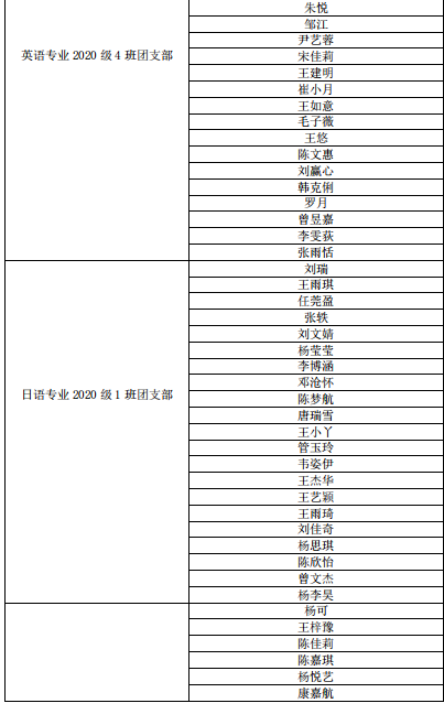 根据《98堂 团委团支部评级办法(试行稿)》文件要求,98堂 开展 2020-2021 学年第二学期团支部、团员积分考核评级:“学期内有两个月“青年大学习”主题团课学习记录,综合测评德育分加1 分”。经98堂 团委组织部具体考核评定,报院团委审核批准,现将 2020-2021 学年第二学期综合测评德育分多加 1 分名单公示如下: