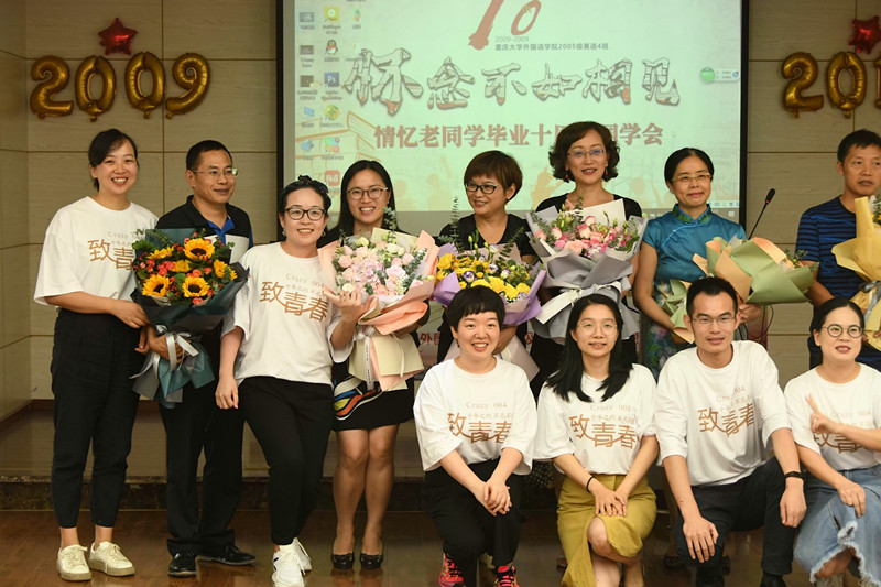 2005级英语四班的校友在学院楼501举办了毕业10周年同学会。学院书记欧玲、院长彭静、副院长李小辉以及雷蕾老师、温忠义老师、杨署东老师(原98堂