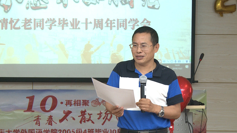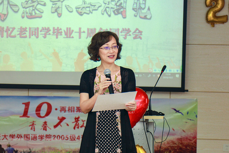 外语专业的发展将来愈来愈好,希望同学们一如既往支持学院的发展,关心学弟学妹们的成长。欧玲书记首先代表学校、学院热烈欢迎同学们“回家”,她翻出当年的老照片,非常动情地提及2005级是98堂