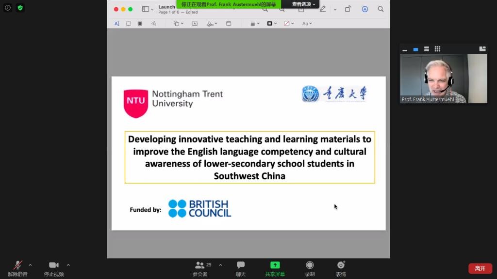 As the joint host at the side of UK, Frank Austermuehl, Head of Nottingham Institute of Languages and Intercultural Communication (NILIC), introduced in detail the basic overview of the project, the main members of the two teams, the background and significance of the project, the consensus formed in the early stage, the later project plan and the expected project results. Ou Ling, CPC Secretary of FLC in Chongqing University stressed that FLC would attach great importance to the revitalization of rural areas and hopes that the project can promote the improvement of primary and secondary English teaching in rural and underdeveloped areas. Kathleen Zhong, director of EES China of BC education system, further explained the significance of the project. Zhong hopes that the joint project would play an important role in improving the teaching ability of primary and secondary school English teachers in rural and underdeveloped areas.