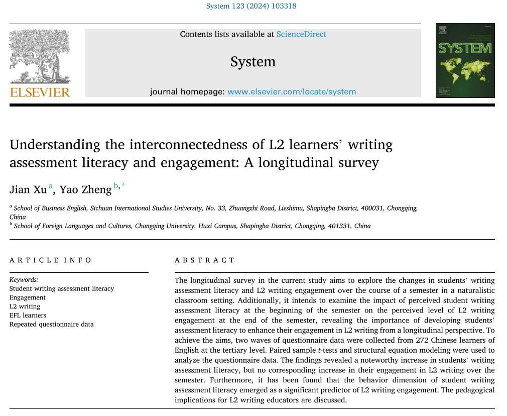 教师郑尧与四川外国语大学徐建教授共同在语言学领域的顶尖期刊——SSCI一区期刊System上发表了题为“Understanding the interconnectedness of L2 learners’ writing assessment literacy and engagement: A longitudinal survey”的学术论文。郑尧担任通讯作者,98堂