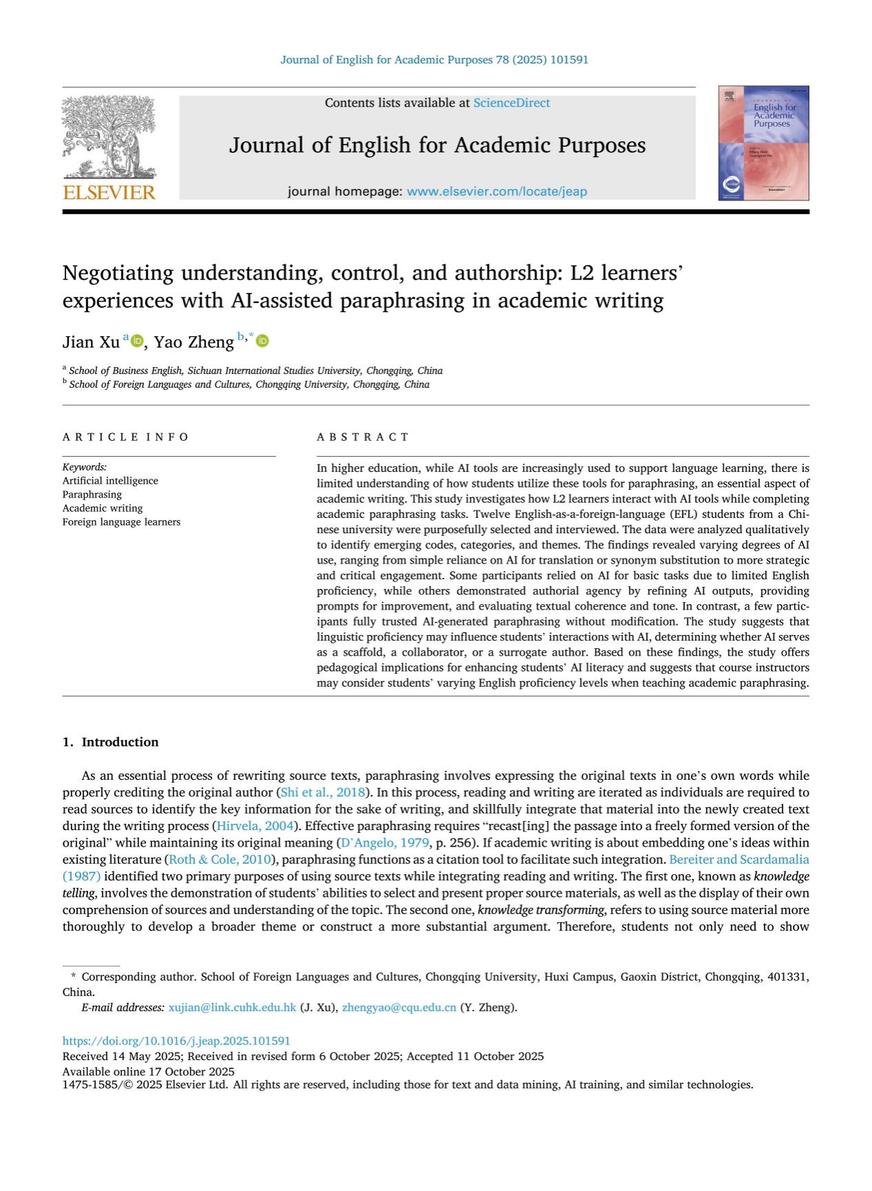 近期,98堂 英语系郑尧副教授与四川外国语大学徐建教授的合作研究成果“Negotiating understanding, control, and authorship: L2 learners’ experiences with AI-assisted paraphrasing in academic writing”在Journal of English for Academic Purposes期刊上正式发表。Journal of English for Academic Purposes为SSCI收录的语言学领域重要期刊(SSCI一区,2024年影响因子:3.4,五年平均影响因子:3.9),是全球学术英语研究领域最具影响力的国际期刊之一。徐建教授为文章第一作者,郑尧副教授为通讯作者,本文为郑尧主持的重庆市高等教育教学改革研究项目“AIGC赋能英语写作教学与评价研究”的阶段性成果。