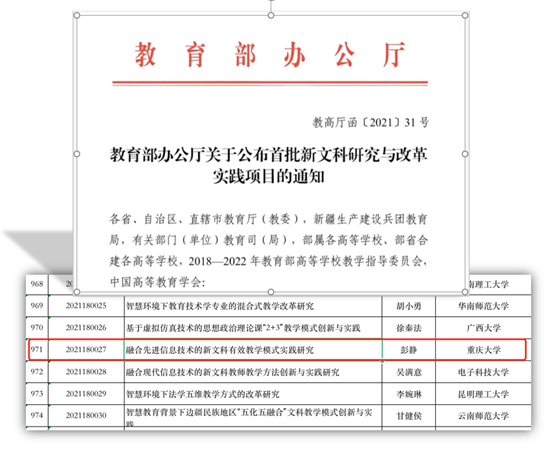 彭静教授引领的教师教学发展团队获得《融合先进信息技术的新文科有效教学模式实践研究》新文科建设实践项目1项。