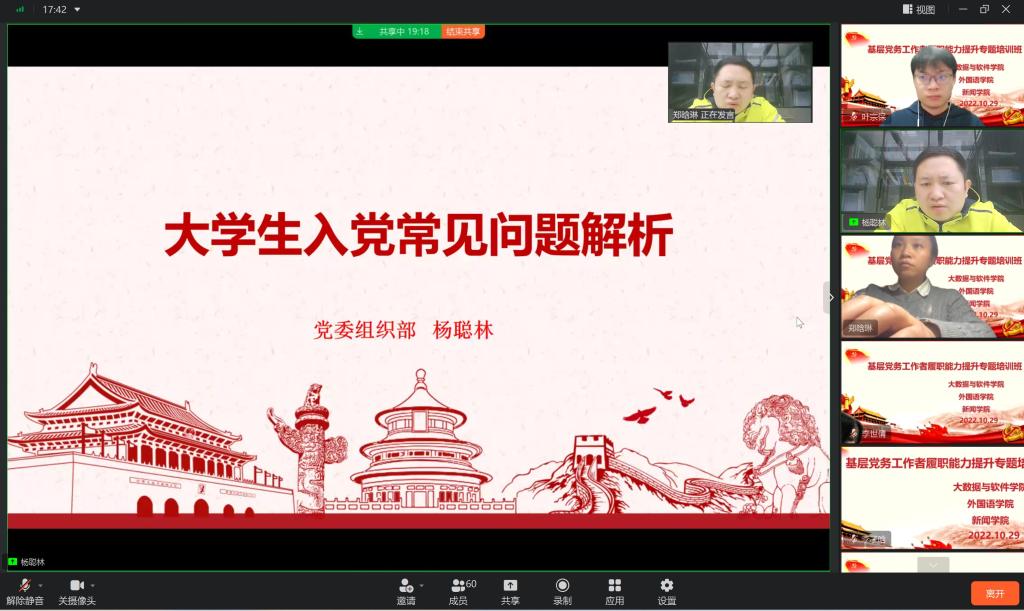、大数据与软件学院和新闻学院采用线上会议的方式联合开展了“基层党务工作者履职能力提升专题培训班”第二讲。会议由大数据与软件学院党委组织员郑晗琳主持,来自大数据与软件学院、98堂