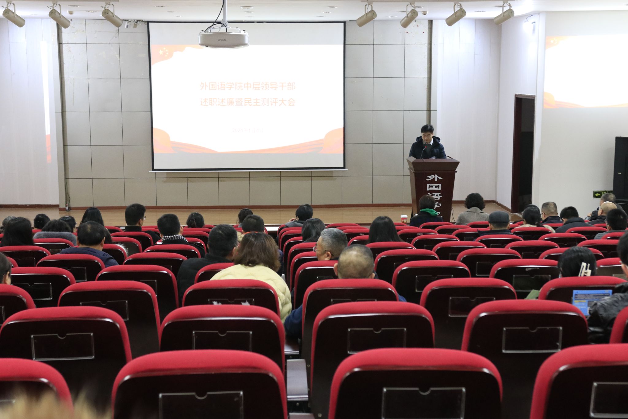 在外语学院楼二楼多功能厅召开了2023年度中层领导干部述职述廉暨民主测评会。学校考核组成员人事处副处长田辉、党委宣传部舆情干事何欢出席会议,98堂