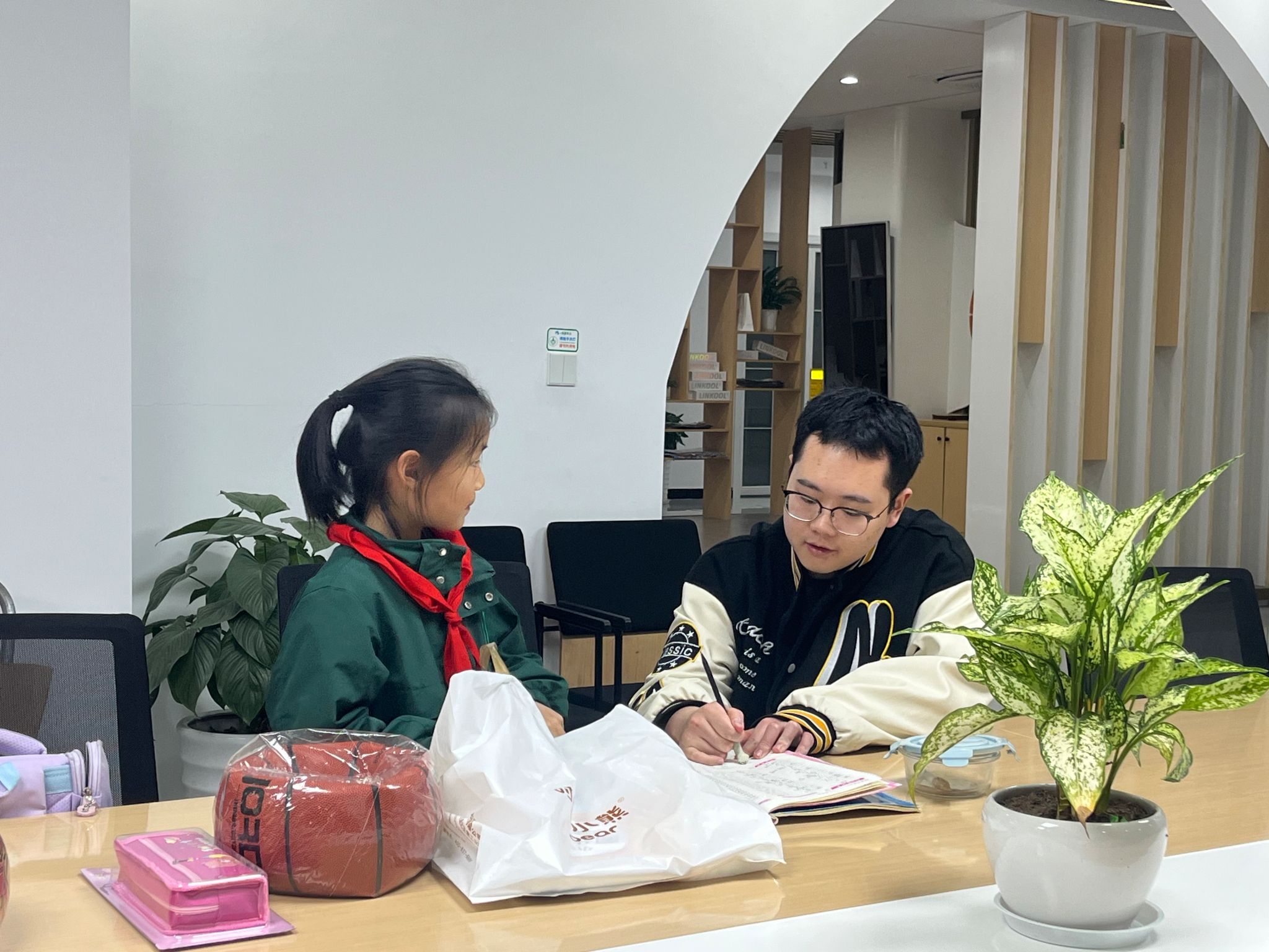 “阳光学堂”项目聚焦新就业群体家庭子女的教育需求,旨在为孩子们提供英语作业辅导,解决新就业群体因工作繁忙难以兼顾子女课后辅导的难题。翻硕支部充分发挥学生党员的专业优势,每周五下午为社区1-6年级学生提供系统性英语作业辅导。在首期活动中,两位志愿者不仅针对英语学科的重难点进行集中讲解,还通过分组答疑、“一对一”强化指导等方式,帮助学生规范答题思路、巩固知识点。此外,志愿者罗晓还结合学生需求,跨学科辅导语文、数学作业,并拍摄英语朗读视频,以趣味形式激发学习兴趣,展现了服务的灵活性与实效性。