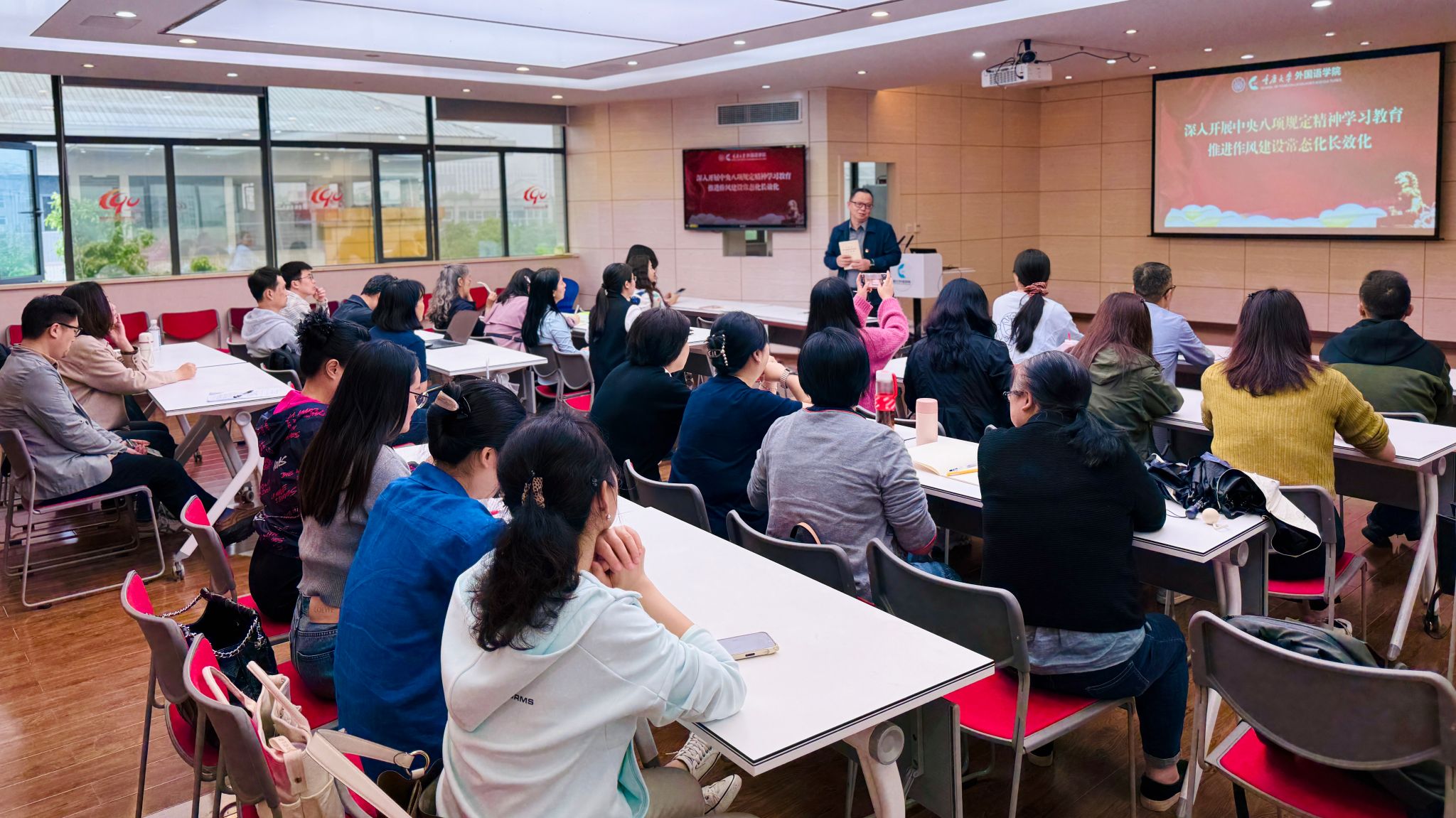 外语专业教工支部和行政教工支部联合开展深入贯彻中央八项规定精神学习教育专题学习,学院副院长杨小虎以《深入开展中央八项规定精神学习教育,推进作风建设常态化长效化》为主题,为支部全体党员讲授专题党课。
