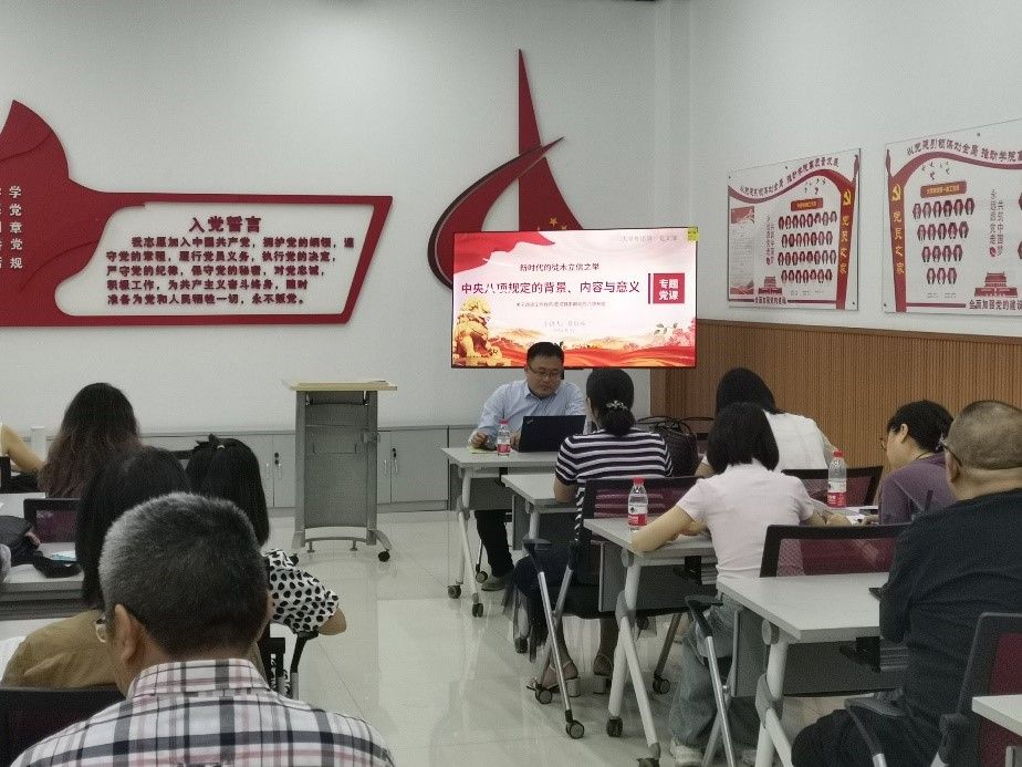 2025年6月12日,98堂 大学英语第一教工党支部开展了“深入贯彻中央八项规定精神学习教育”的专题党课。98堂 院长、联系支部的党委委员莫启扬教授为支部全体党员讲授以“中央八项规定的背景、内容与意义”为主题的党课。