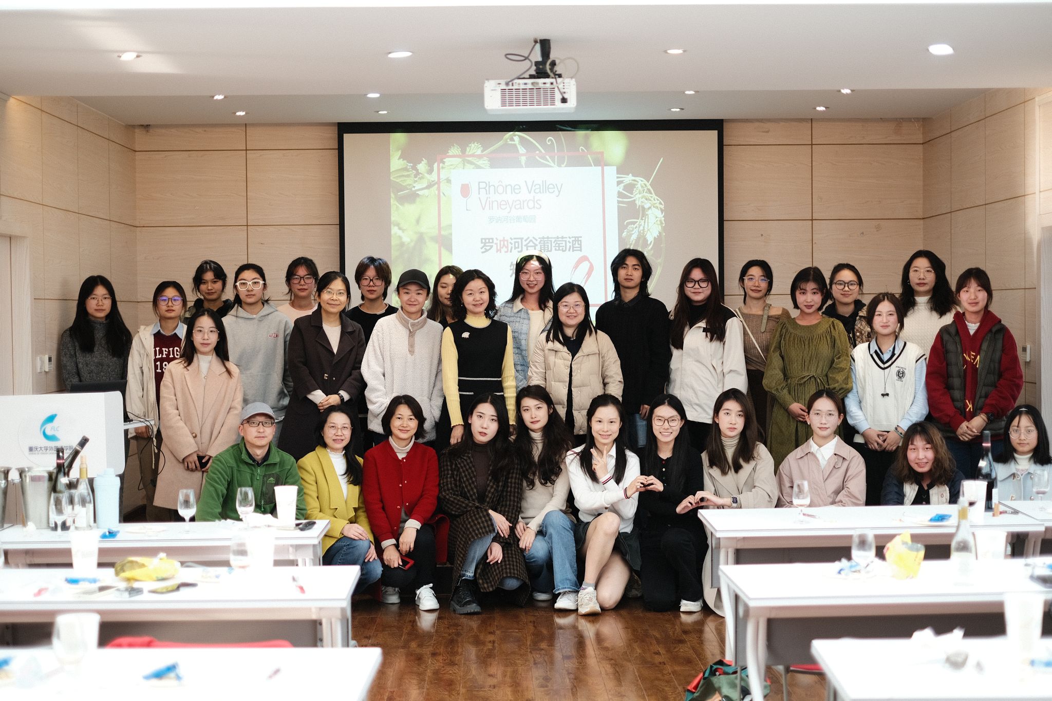 教师孙莺老师。孙莺老师曾获得WSET Diploma英国葡萄酒与烈酒四级文凭和波尔多左岸骑士会荣誉骑士勋章等称号,同时也是德国、新西兰、智利、阿根廷葡萄酒官方讲师。孙老师通过品鉴多款罗讷河谷葡萄酒,详细介绍了葡萄酒的酿造过程、品鉴方法以及葡萄酒与美食的搭配技巧。在场师生一边品味美酒,一边交流心得,现场氛围热烈而愉快。