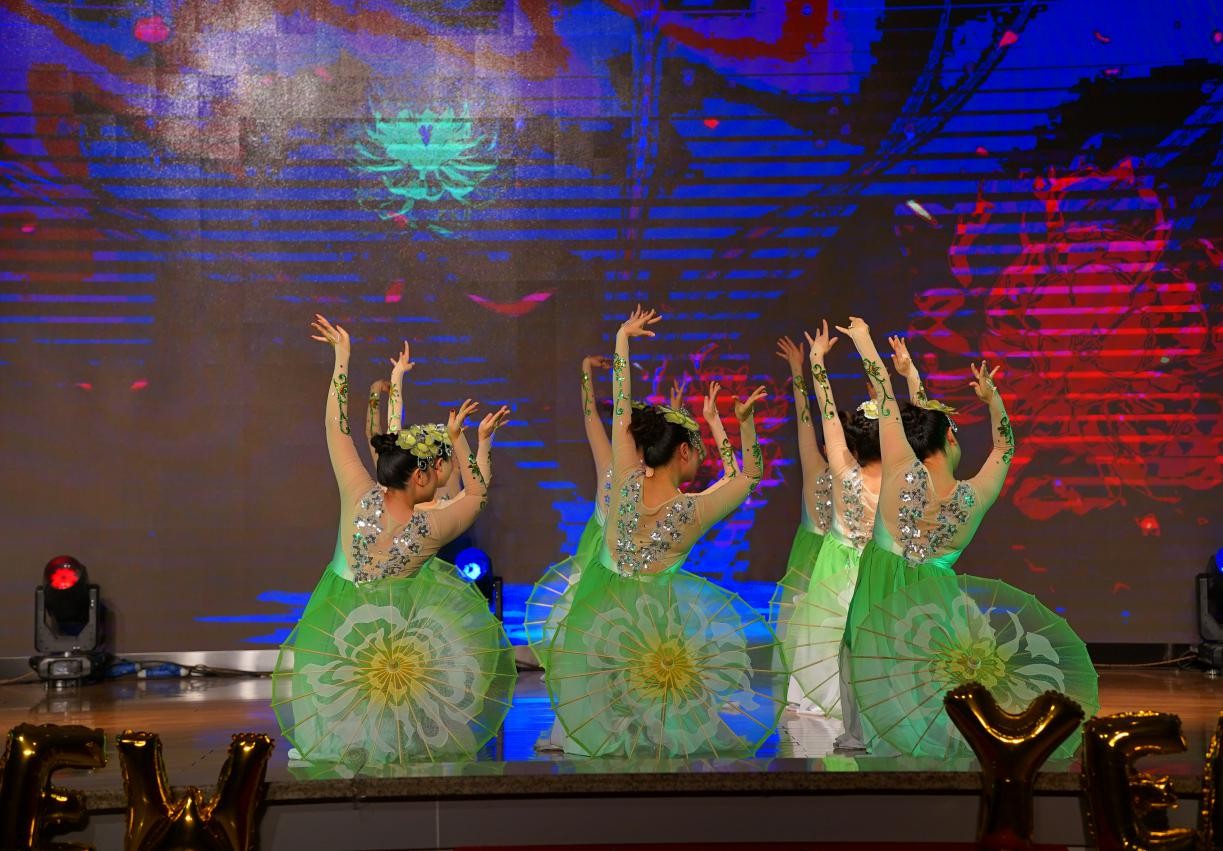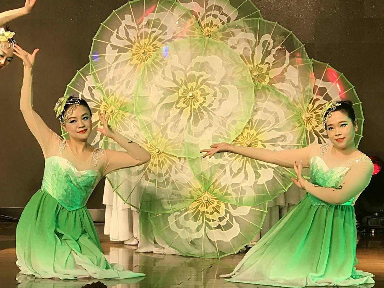 最为震撼和精彩的莫过于舞蹈高潮部分,所有舞者飞向了中心将手里的花伞撑开,共同拼成了一朵硕大而绚烂的茉莉花,盛开在大家的眼前,台下多次掌声响起!来自德国的外教Sonja忍不住赞叹老师们的表演太专业了,给她留下了非常深刻的印象!