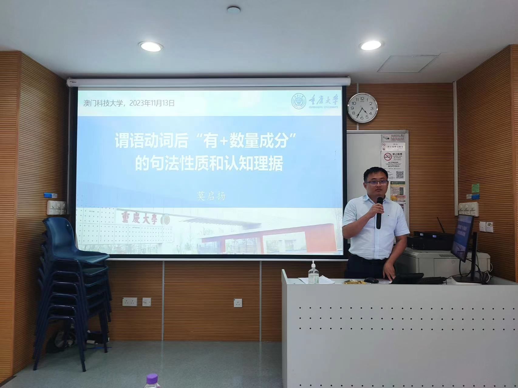 院长莫启扬教授带队前往澳门大学和澳门科技大学两所大学进行了交流访问。期间,莫院长受邀分别以“英语动词前置构式的句法语义和认知理据”与“谓语动词后‘有+数量成分’的句法性质和认知理据”为题,进行了两场讲座。讲座在两所大学的学术报告厅举行,吸引了众多学生和教师参加。