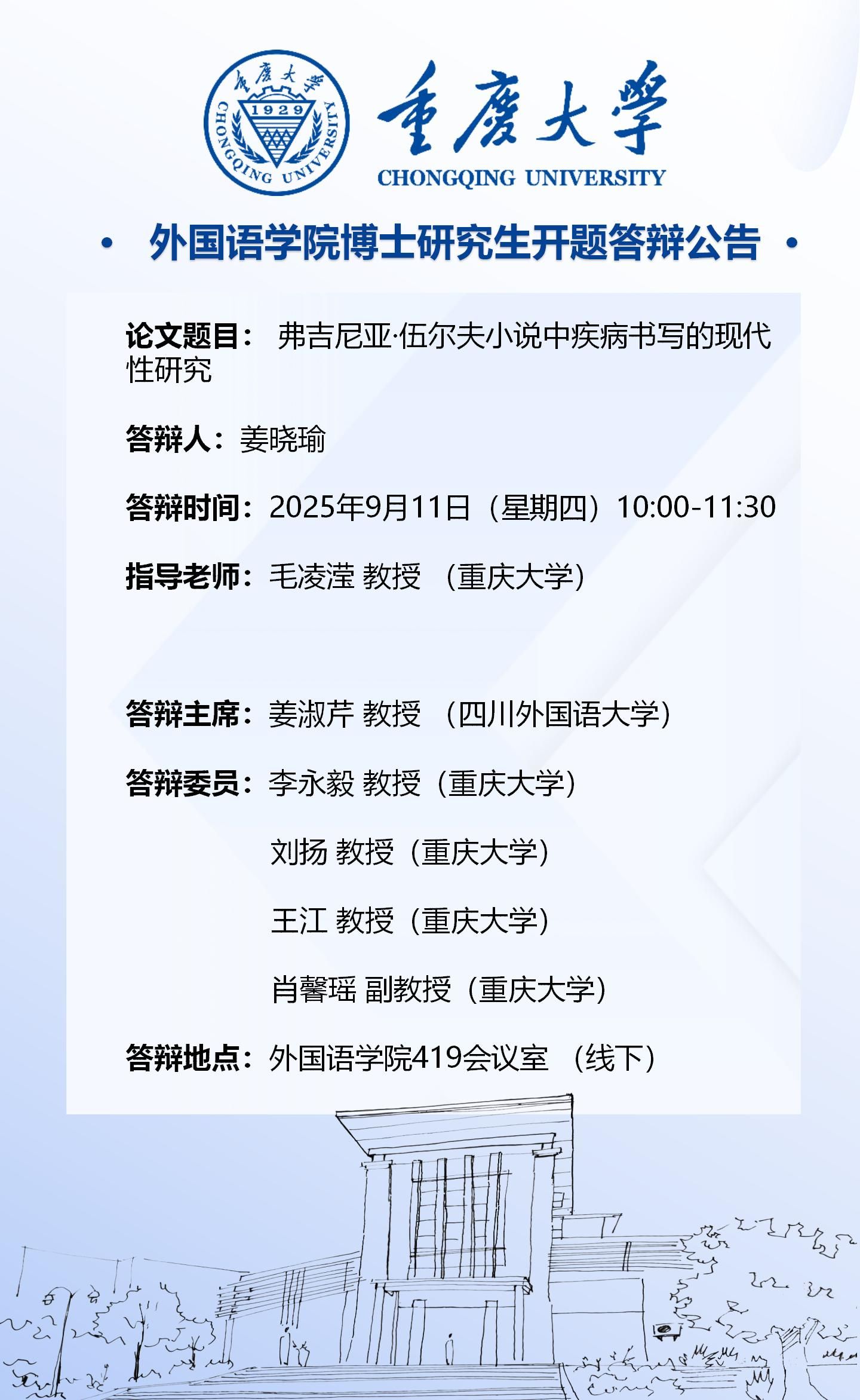 98堂 2022级外国语言文学专业(文学方向)博士开题答辩将于2025年9月11日进行,答辩安排见附件。
