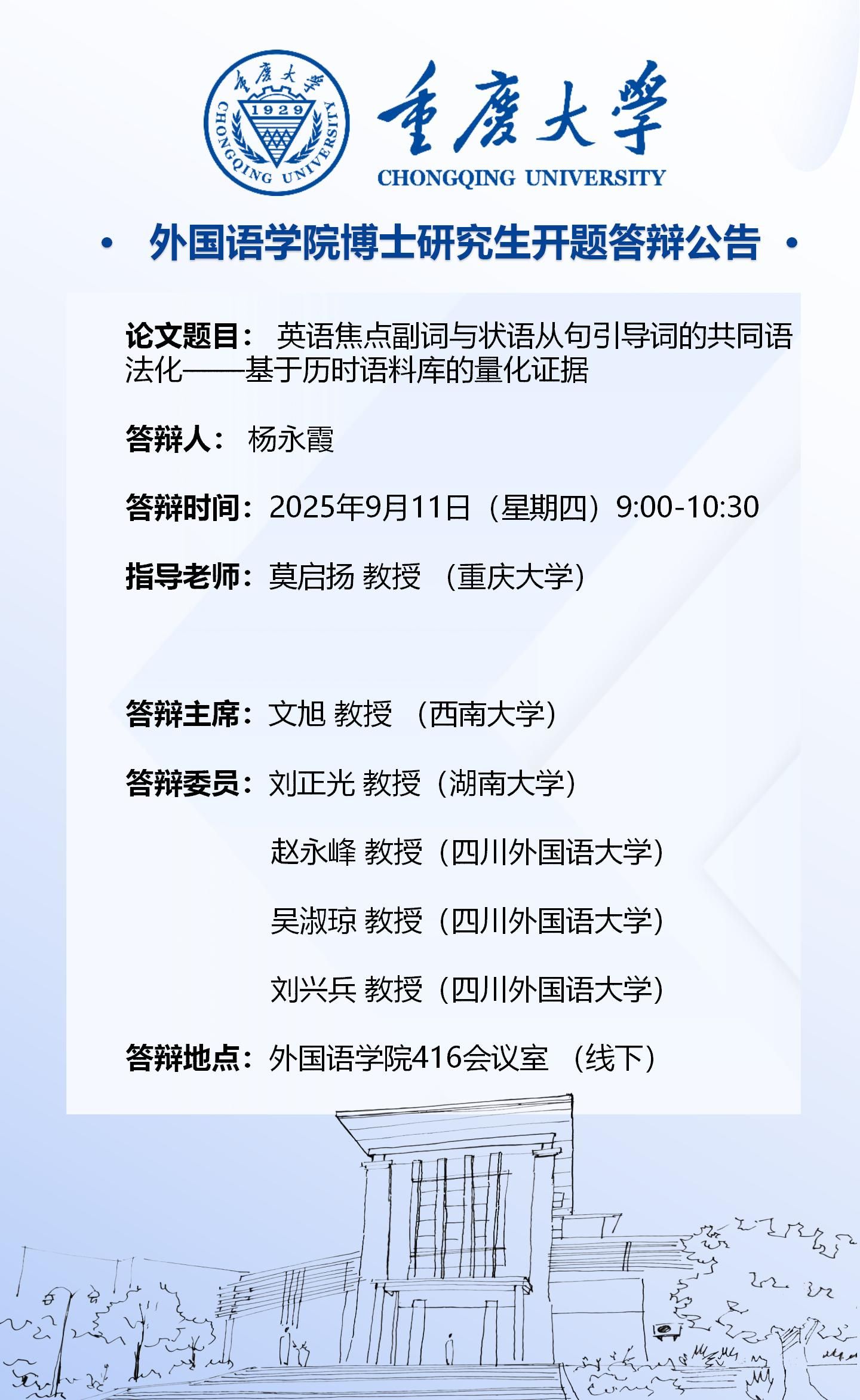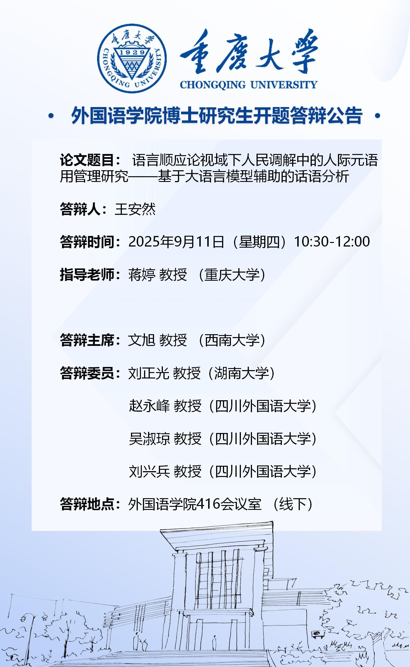98堂 2023级外国语言文学专业(语言学方向)博士开题答辩将于2025年9月11日进行,答辩安排见附件。