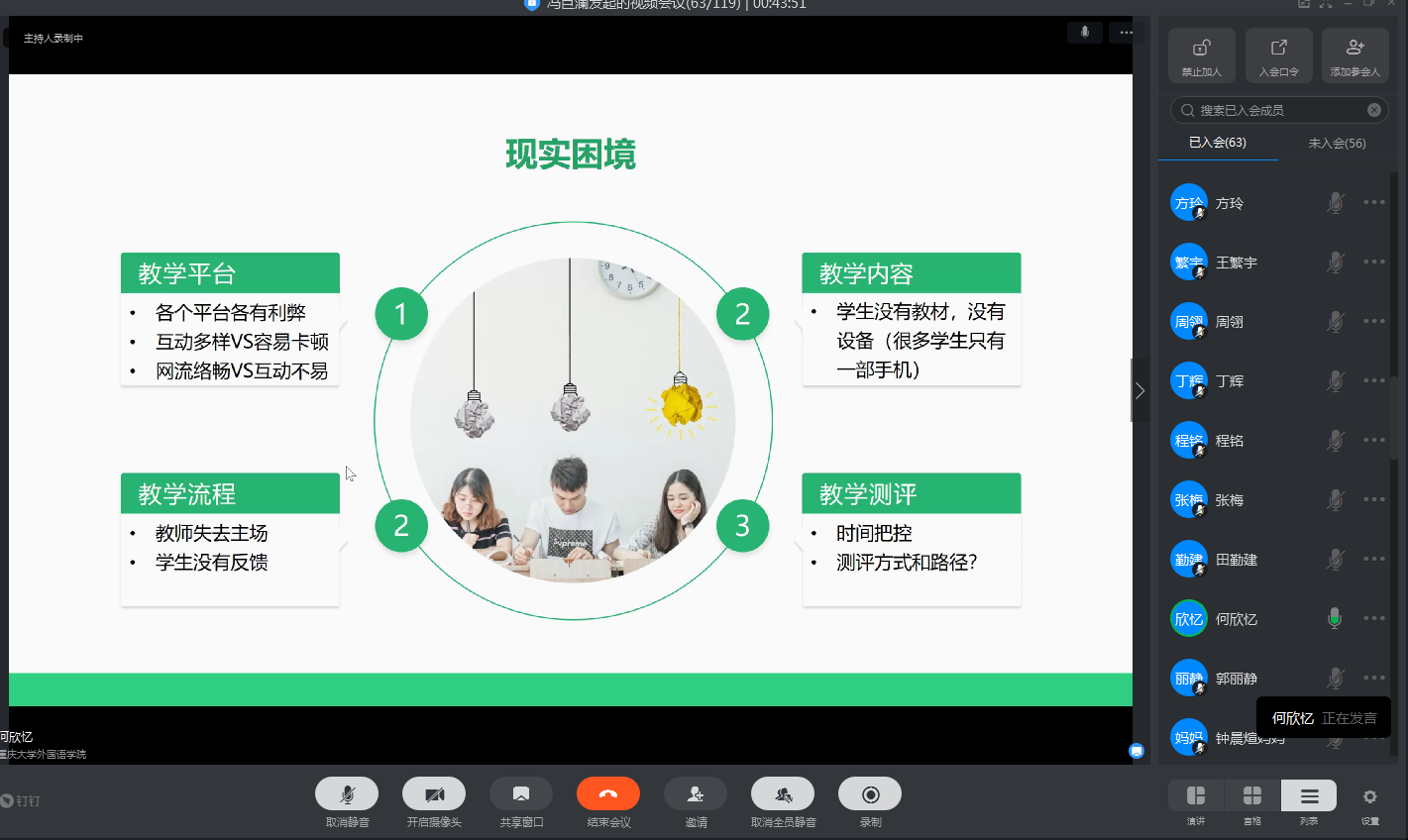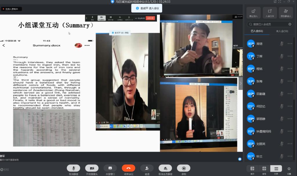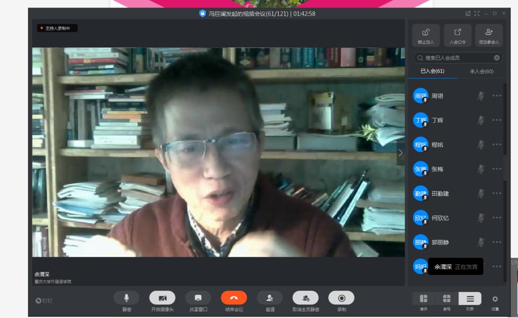 大学外语教育中心通过钉钉视频直播平台举行了拓展课程公开教研会,来自拓展课程系列各课程组的三位老师分别从云课堂的教学设计、线下课堂的在线化改造、云课堂互动教学设计、以及课程思政等方面分享了本学期开展云课堂教学以来的诸多经验和反思。本次教研活动有包括学院教授、领导、课程协调人等在内的60多位教职员工参加、由大外中心副主任冯巨澜主持。