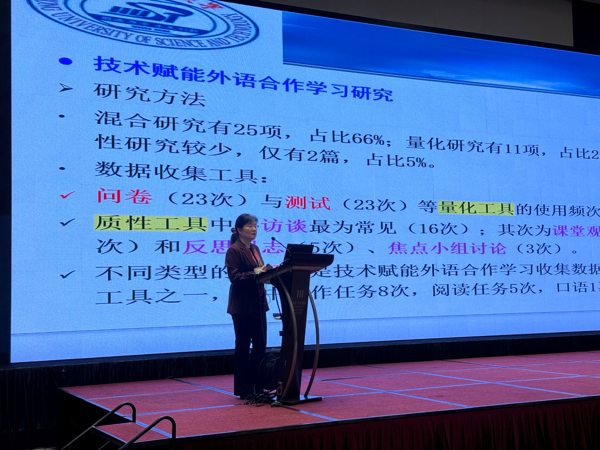 徐锦芬教授做了题为《技术赋能下大学英语教学创新研究》的报告,首先,徐老师分析了新时代外语教学新特征,梳理了国内外有关技术赋能教育的相关研究进行了梳理,并以自身团队开展的两个研究为为例阐释了外语课程教学研究的视角、方法和方向。随后,徐老师还引导与会教师如何提出研究问题、开展科学研究,开展科学研究,希冀广大外语教师不断提升自己,为大学英语的提质增效作出贡献。与会教师积极与徐教授在英语教学研究等方面进行了沟通和交流。
