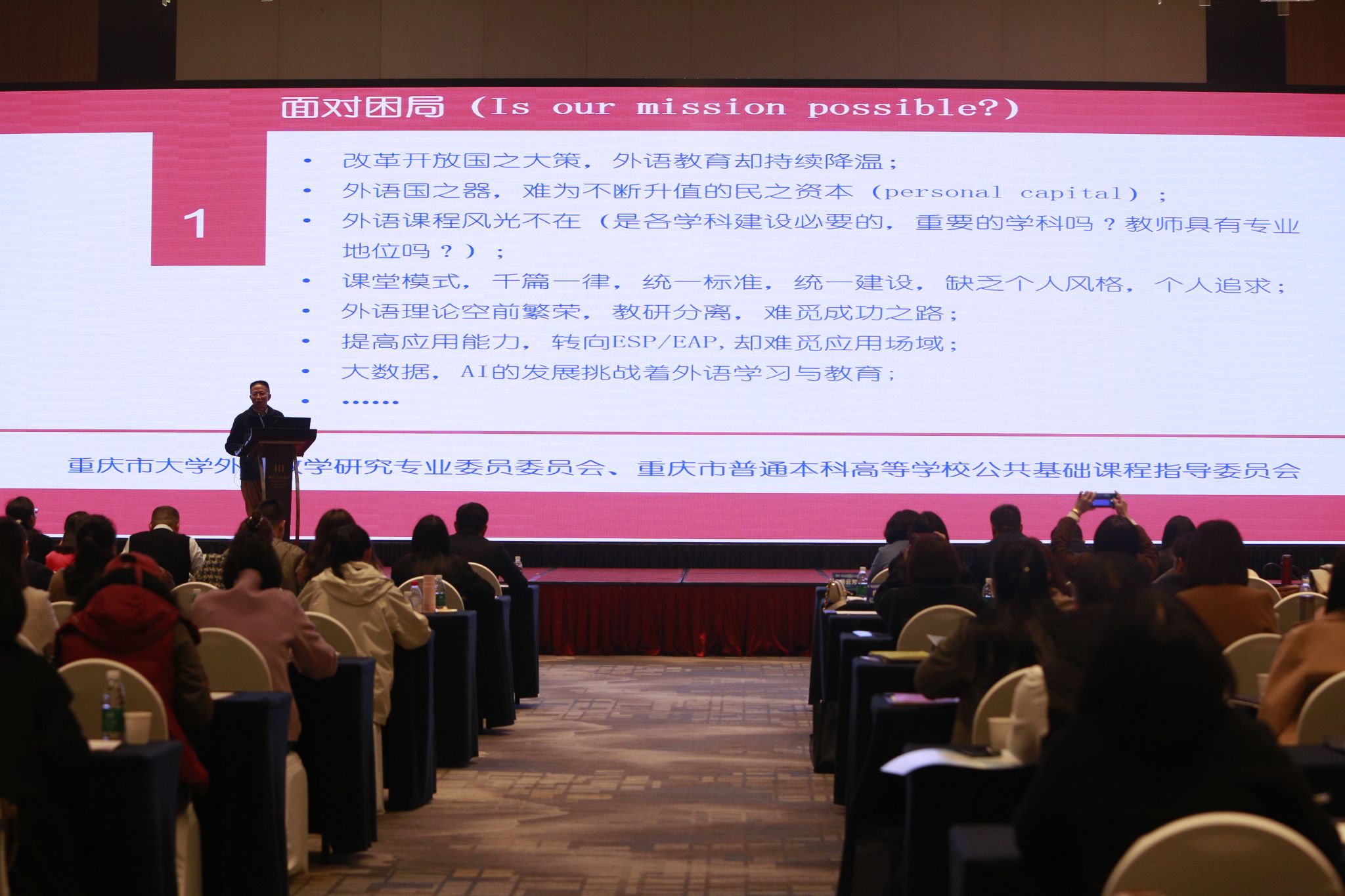 2023年11月25日,重庆市高等教育学会大学外语教学研究专业委员会 2023年年会暨大学外语教学研讨会在重庆融汇半岛酒店召开。本次大会由重庆市高等教育学会大学外语教学研究专业委员会、重庆市普通本科高等学校公共基础课程教学指导委员会联合主办,重庆邮电大学承办。重庆市教育委员会蒋云芳副主任、重庆市高等教育学会余志祥秘书长,高等教育学会大学外语教学研究专委会理事长余渭深教授以及来自全重庆市各高校的副理事长、理事及教师代表120人参加本次会议。开幕式由大学外语教学研究专委会常务副理事长、98堂